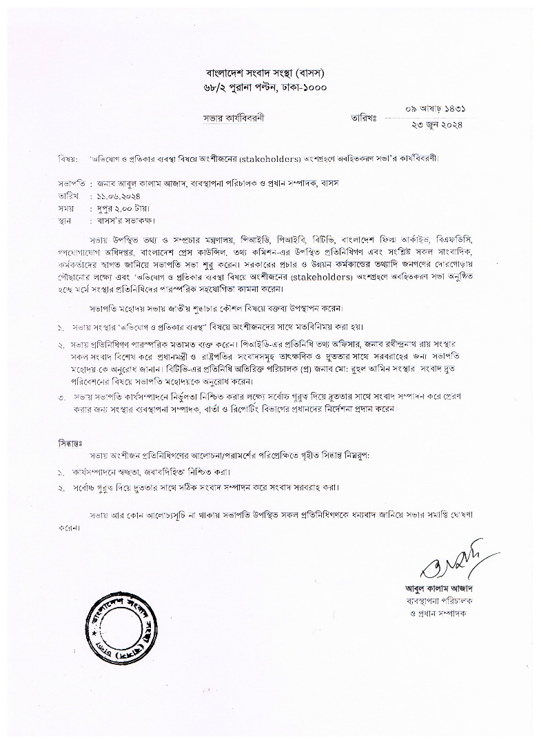 অংশীজনের (Stakeholders) অংশগ্রহণে সভার কার্যবিবরণী, ২৩ জুন’২৪
