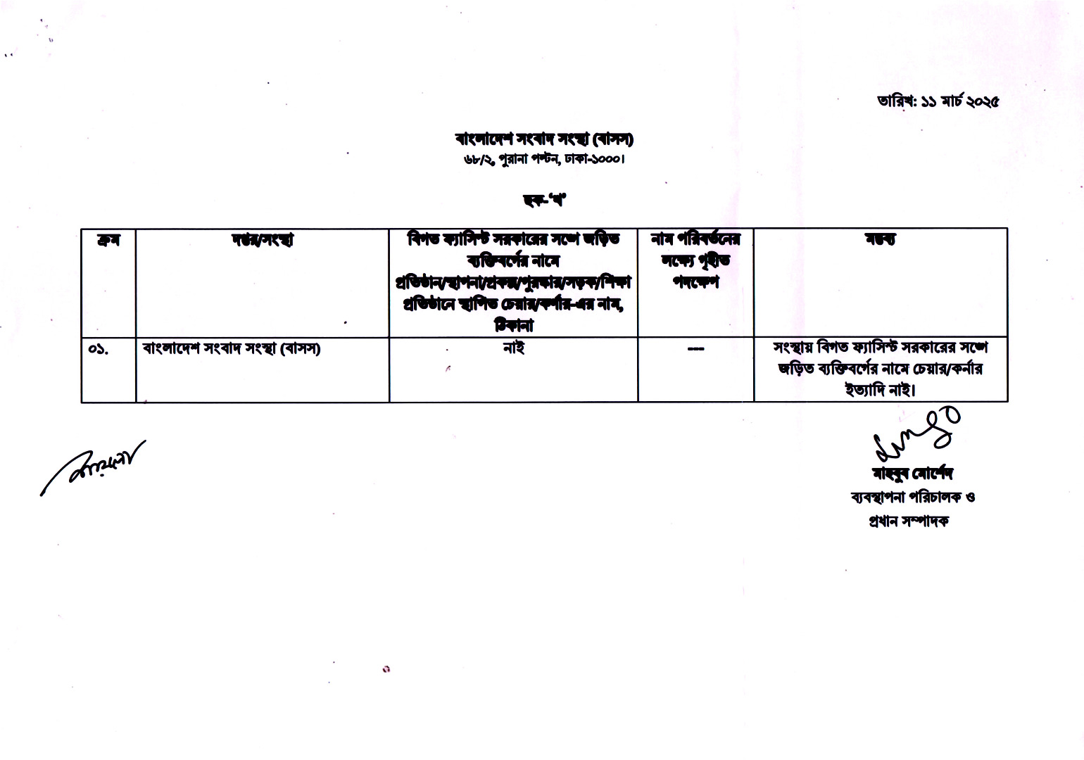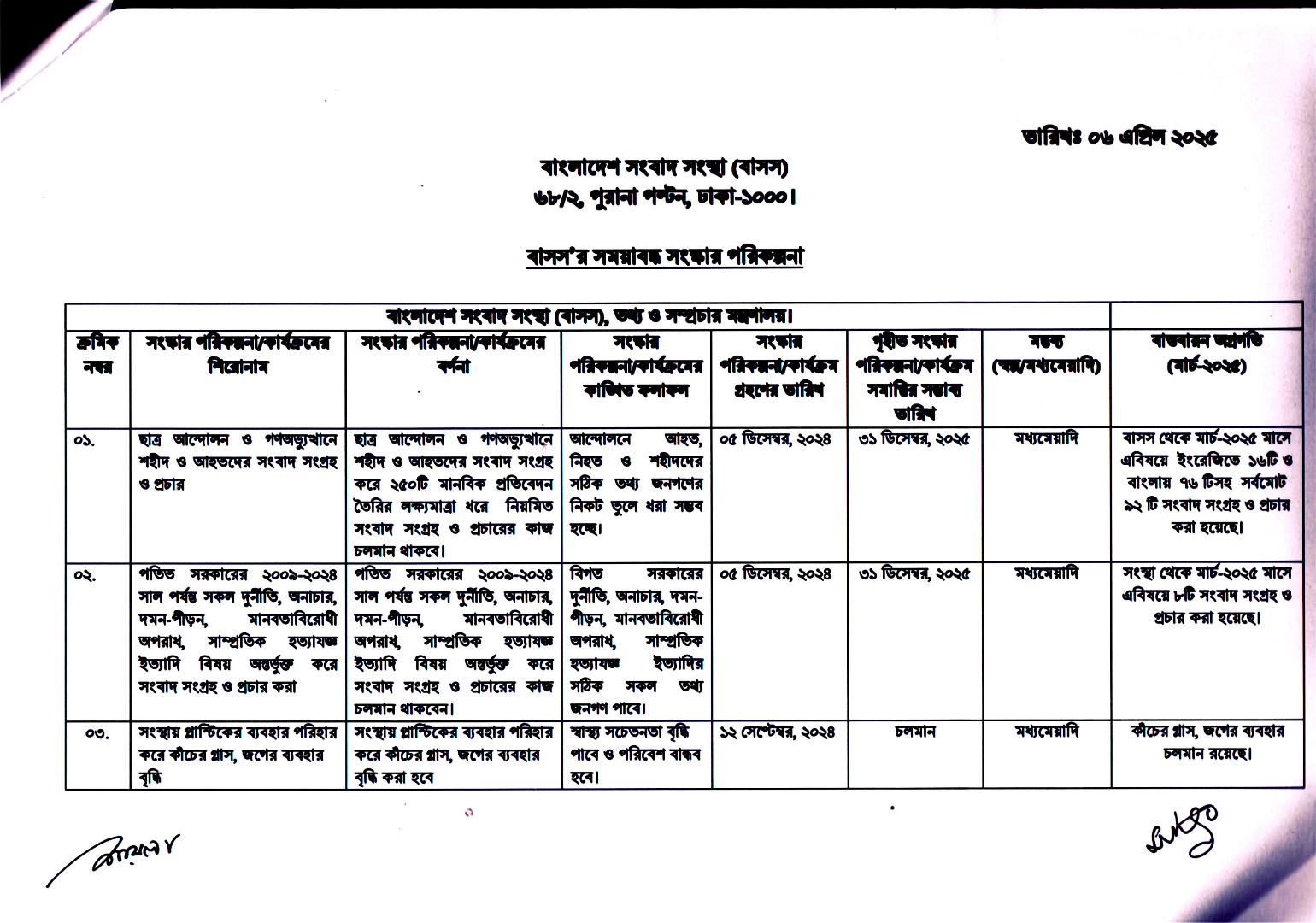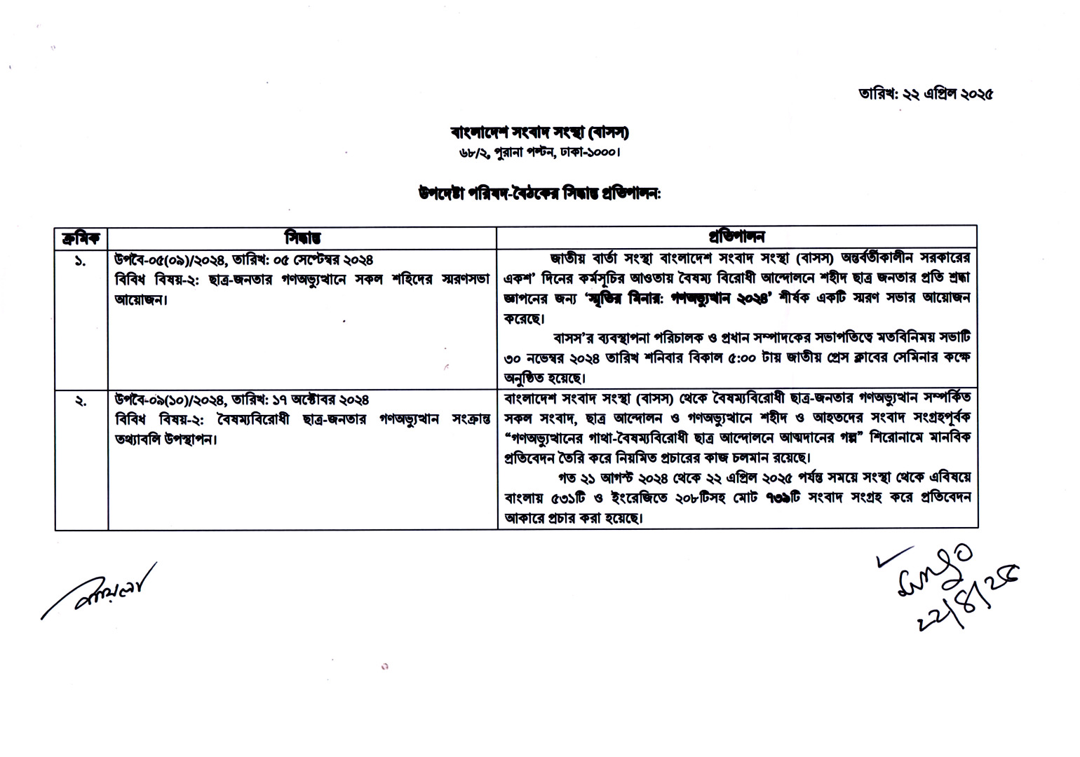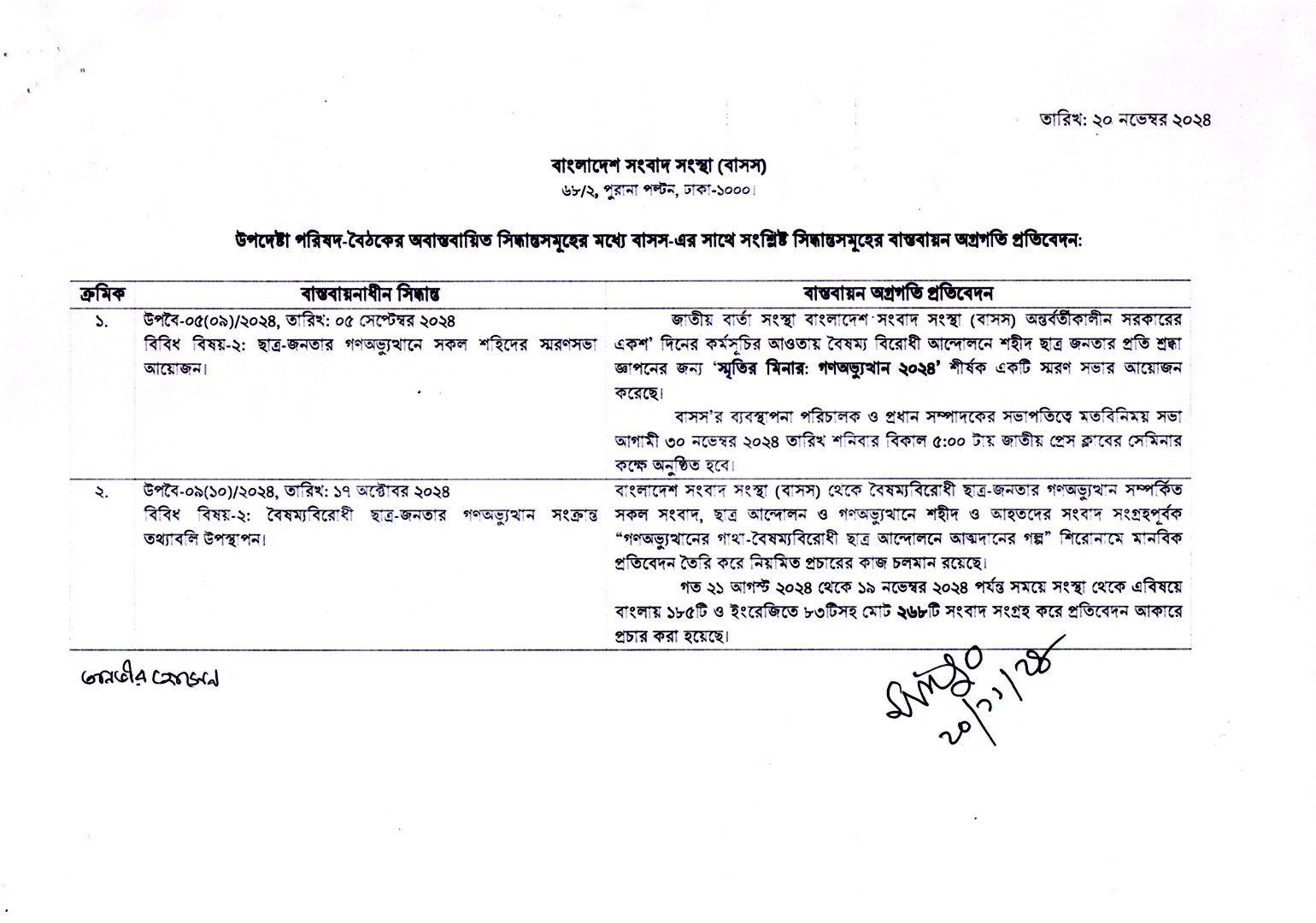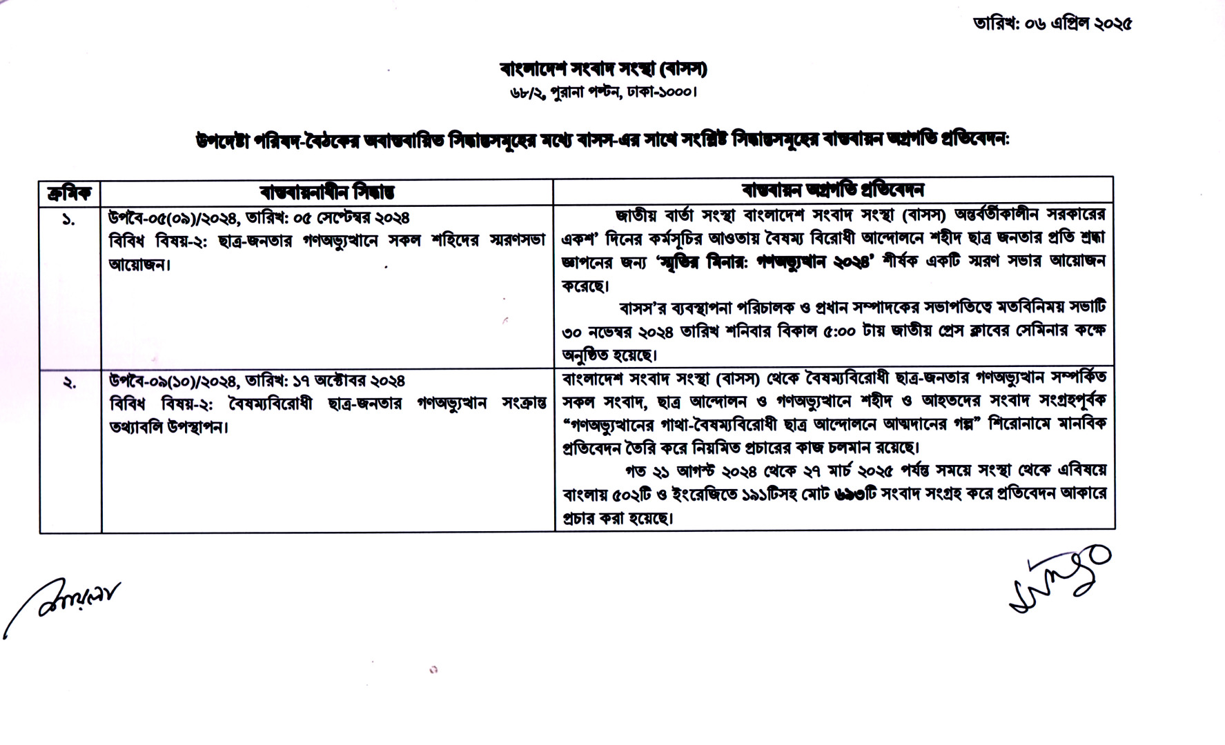 বাসস কর্তৃক গৃহীত সংস্কার, উন্নয়নমূলক ও গণঅভ্যুথান সংশ্লিষ্ট উল্লেখযোগ্য কার্যক্রম, অর্জনের তথ্য