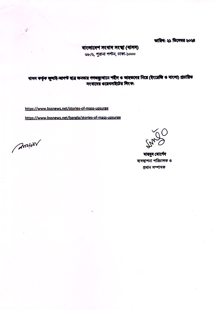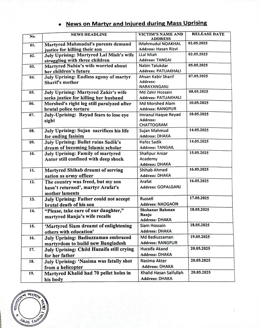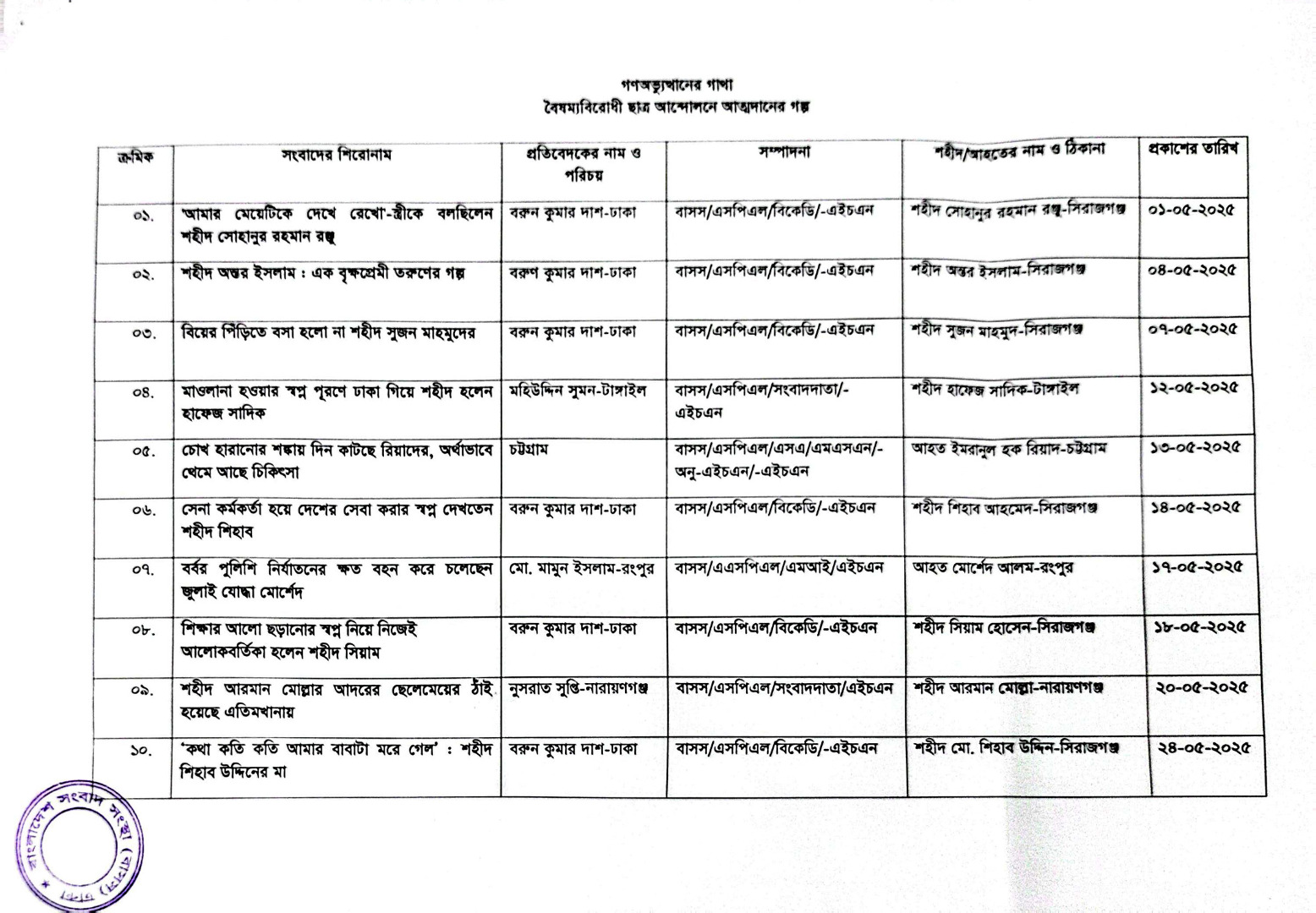 বাসস কর্তৃক জুলাই-আগস্ট ছাত্র জনতার গণঅভ্যুত্থানে শহীদ ও আহতদের নিয়ে (ইংরেজি ও বাংলা) প্রচার
