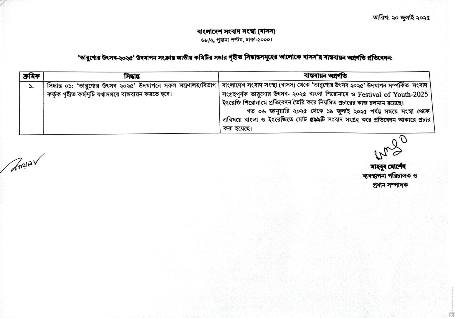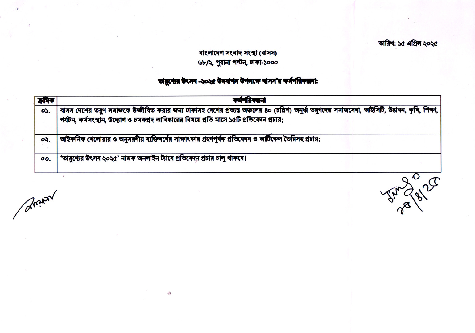 তারুণ্যের উৎসব উপলক্ষ্যে বাসস’র কর্মপরিকল্পনা, মে ২০২৫