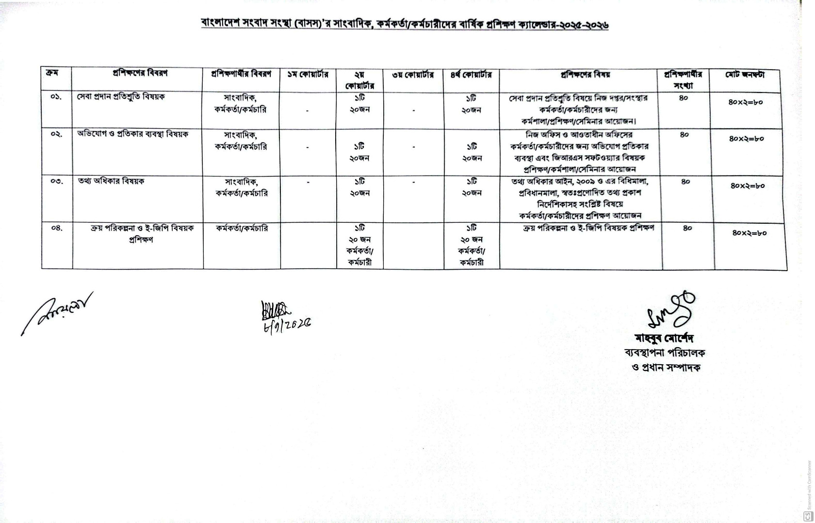 সাংবাদিক, কর্মকর্তা-কর্মচারীদের বার্ষিক প্রশিক্ষণ ক্যালেন্ডার ২০২৫-২০২৬