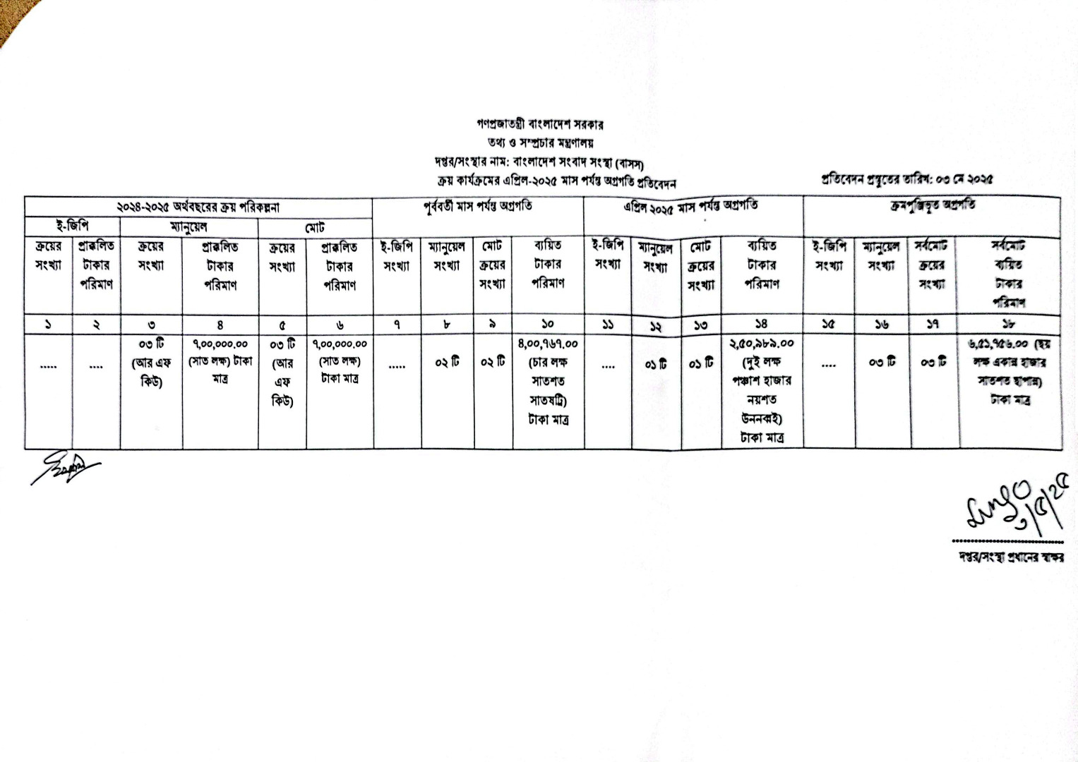 ২০২৪-২৫ অর্থ বছরের ক্রয় পরিকল্পনা অনুযায়ী (এপ্রিল-২০২৫) ক্রয় কার্যক্রমের অগ্রগতি প্রতিবেদন