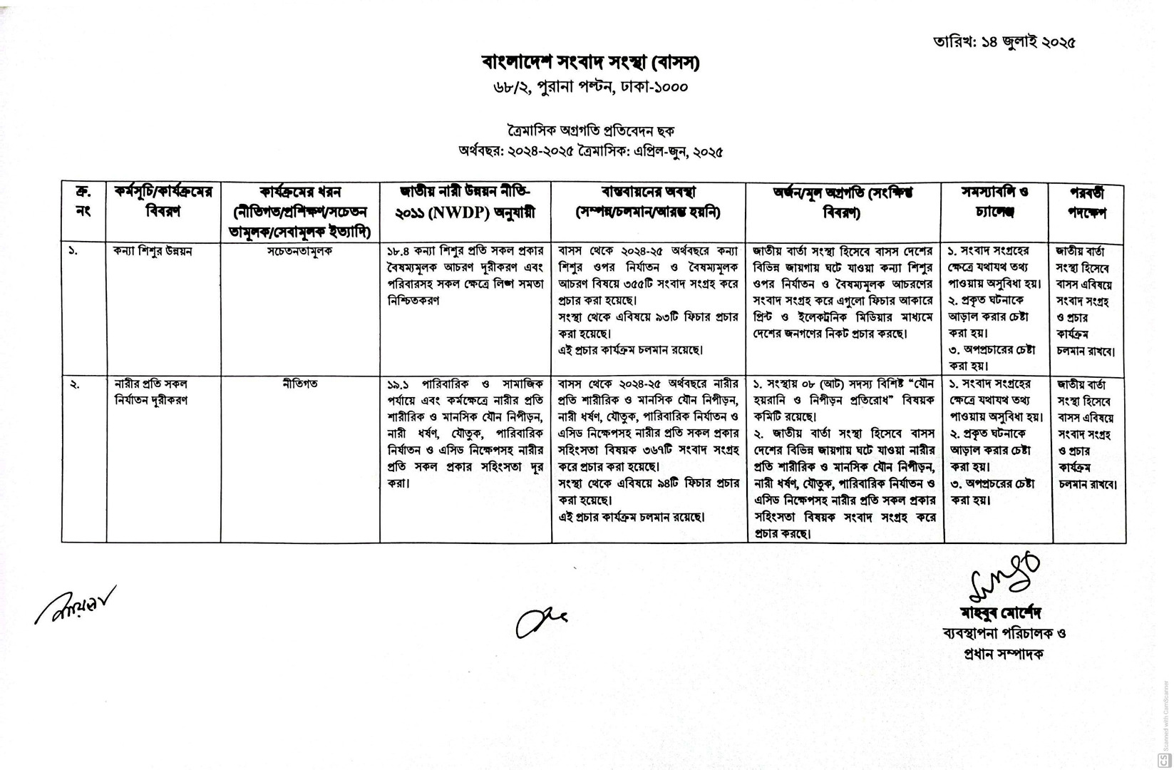 বাংলাদেশ অর্থনৈতিক সমীক্ষা ২০২৫’-এ অন্তর্ভুক্তির জন্য বাসস’র তথ্যাদি/পরিসংখ্যানসহ প্রতিবেদন