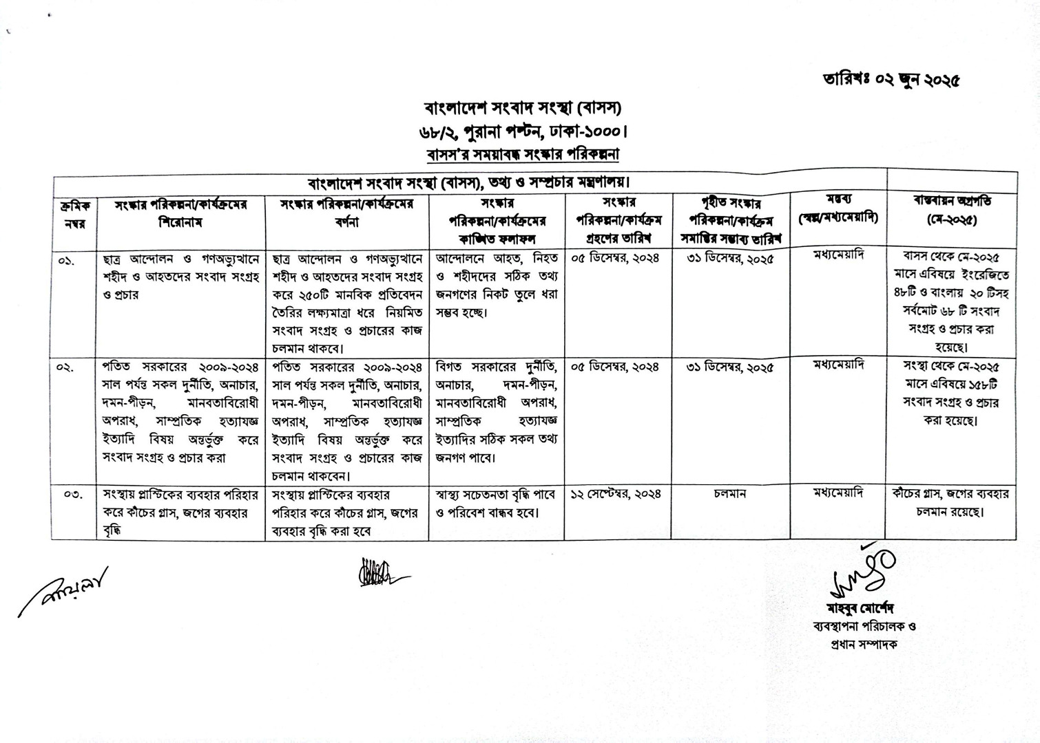 বাসস’র সময়াবদ্ধ সংস্কার পরিকল্পনা, জুন ২০২৫