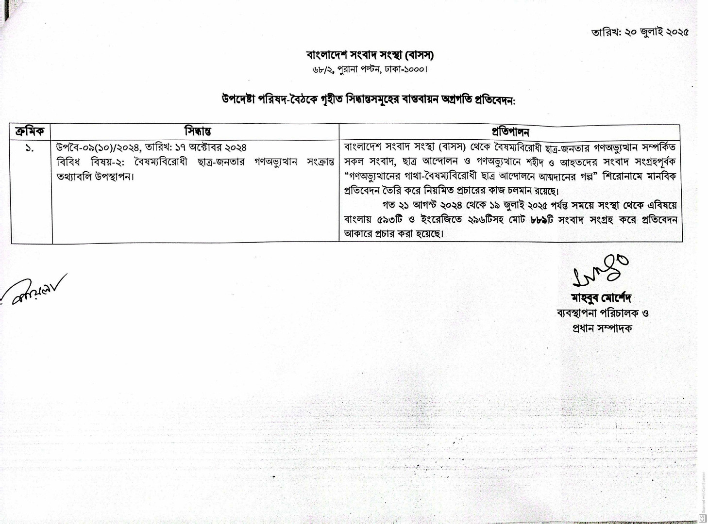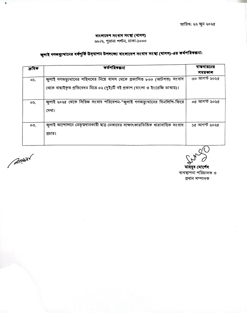 জুলাই গণঅভ্যুত্থানের বর্ষপূর্তি উদ্বযাপন উপলক্ষ্যে বাসস-এর কর্মপরিকল্পনা
